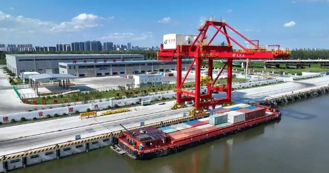 京杭大运河的支流龙拱河畔,一个智慧化集装箱内河港口已然成形。自动化轨道吊升降腾挪装卸集装箱,无人集卡满载集装箱来回穿梭在港口和堆场之间,货船、进港的火车和汽车鸣笛声交织回响,呈现一片繁忙景象。这里便是龙拱港,全国第一家常态化运行无人智能水平运输的内河港口。