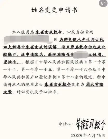 据媒体报道,这位现在真名就叫“朱雀玄武敕令”的湖南24岁小伙,出生时的名字为朱云飞,从2024年5月开始,已经先后改名为“朱雀玄武”、“朱雀玄武敕令”。今年4月16日,他又申请改名为“周天紫薇大帝”。一年之内三四次改名字,而且都是“玄之又玄”的字眼,被拒绝后还来一个玉皇大帝的全号,简直就是把姓名当儿戏。