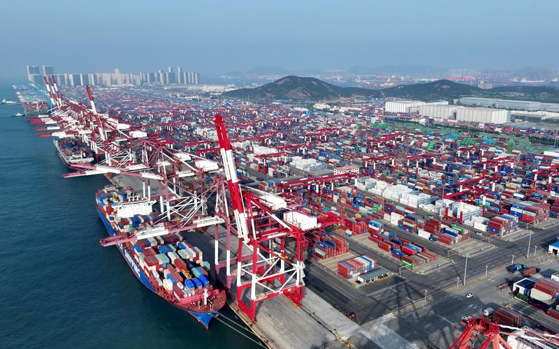 ▲4月30日,货轮在青岛港前湾集装箱码头装卸集装箱(无人机照片)。图/新华社