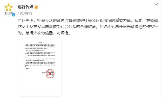 5月16日,黄杨钿甜所属经纪公司嘉行传媒发布声明称:我司、黄杨钿甜女士及其父母愿意接受社会公众的合理监督,但绝不姑息任何恶意造谣的侵权行为,恳请大家勿信谣、勿传谣。