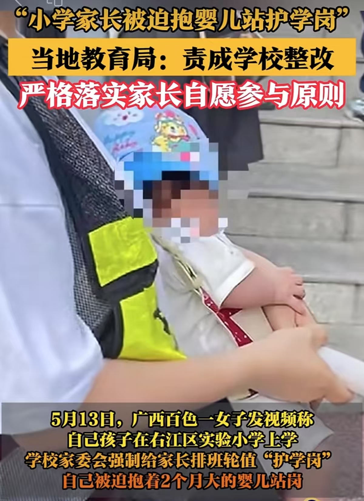 据媒体报道,5月13日,在广西百色,女子发视频称,自己孩子在右江区实验小学上三年级,学校家委会强制给家长排班轮值护学岗,自己被迫抱着2个月大的婴儿站岗。对此,右江区教育局工作人员表示,“参加护学岗是自愿的。”