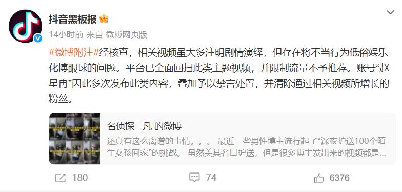 短视频玩起了新剧本。据中国青年报报道,近日,有网友反映:最近一些男性博主流行起了“深夜护送100个陌生女孩回家”的挑战。@抖音黑板报6月2日晚间发布了相关处理进展:经核查,相关视频虽大多注明剧情演绎,但存在将不当行为低俗娱乐化博眼球的问题。平台已全面回扫此类主题视频,并限制流量不予推荐。账号“赵星冉”多次发布此类内容被禁言。