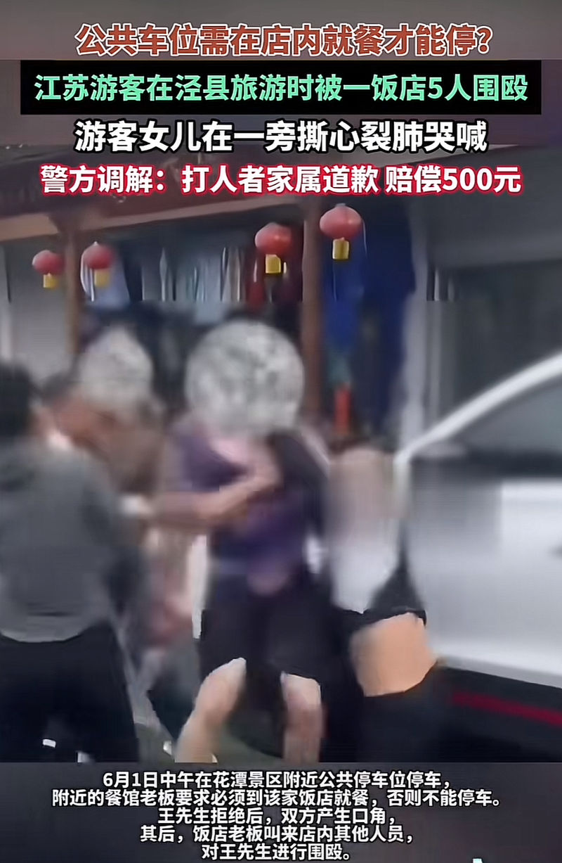 据报道,江苏镇江游客蔡某6月1日携妻子女儿到安徽泾县桃花潭旅游时,因停车引起纠纷遭土菜馆经营户及其家人殴打。