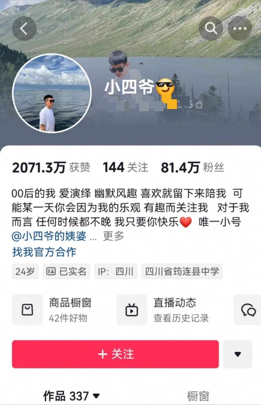 “小四爷”是短视频平台上颇有名气的搞笑博主,在其自我简介中,称自己爱演绎、幽默风趣,也通过各种搞笑的演绎收获了82.4万的粉丝量。他突然在网络上消失之后,不少网友都以为他赚够了,退网了,没想到竟然是落网了,实在是令人震惊又唏嘘。