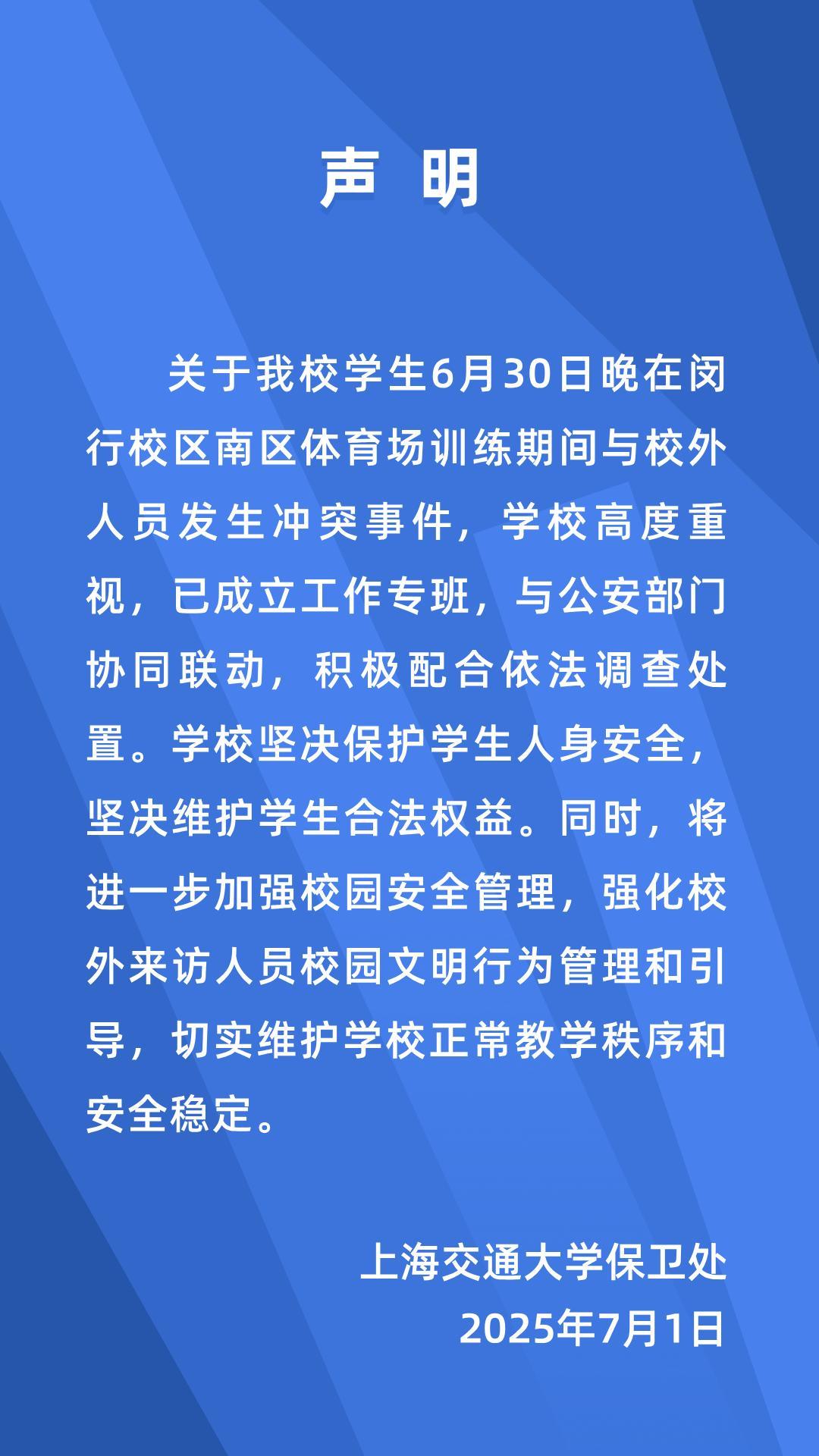 7月2日,上海交通大学保卫处发布声明称,关于此事已成立工作专班,与公安部门协同联动,积极配合依法调查处置。学校坚决保护学生人身安全,坚决维护学生合法权益。(据7月2日澎湃新闻)