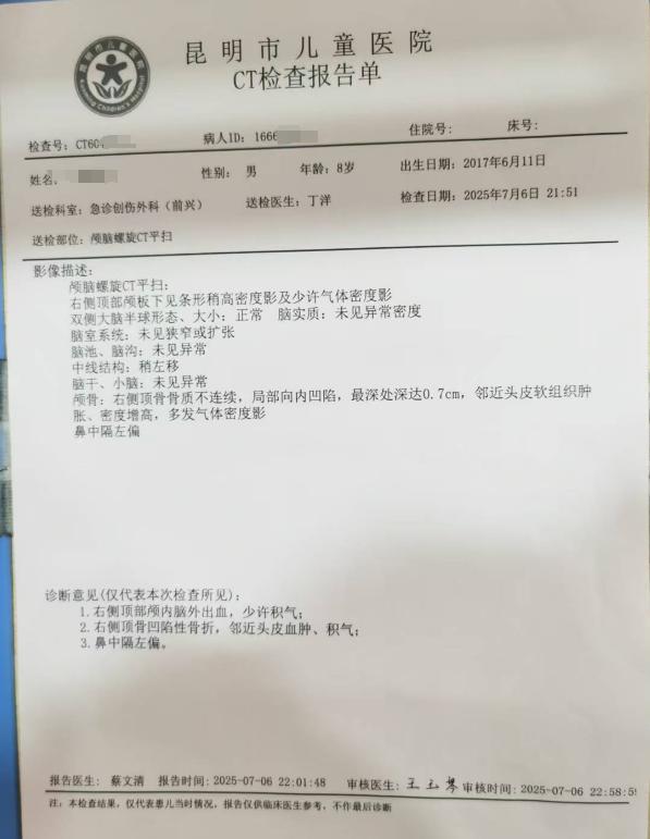 7月6日晚8时许,云南省昆明市官渡区一街边的牛肉火锅店门口,一名喝醉的中年男子突然抡起板凳砸向另一名食客,板凳恰好砸到骑车路过的8岁男孩头上,孩子顿时头破血流。肇事者的妻子称,其丈夫在和老乡喝酒、劝酒过程中,误伤到了孩子。