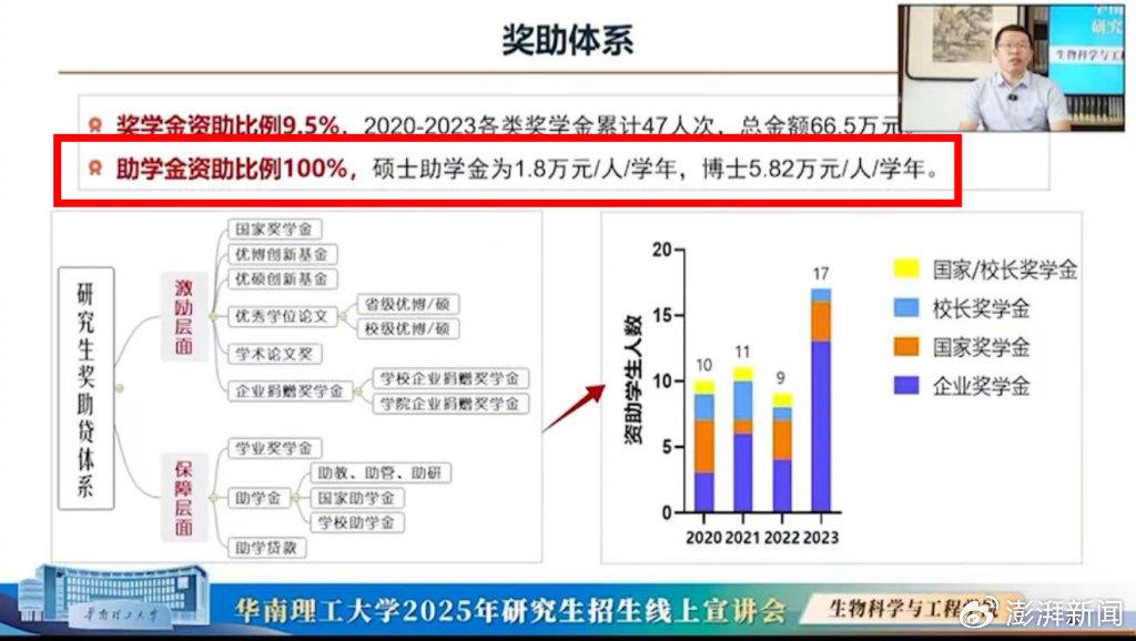 华南理工大学2025年研究生招生线上宣讲会(生物科学与工程学院专场),招生老师称该校助学金资助比例为100%,硕士助学金为每学年1.8万元。来源:华南理工大学研招办视频号直播回放截图