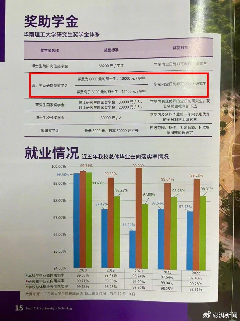 该校多名即将入学的硕士研究生反映称,招生宣传时学校工作人员和手册中明确奖学金系“全覆盖”,每学年发放1.8万元或1.54万元奖助学金,如今又改成分级发放,希望学校兑现招生承诺。7月16日,华南理工大学学校办公室工作人员表示,研究生院已掌握学生反映情况,“具体应该会有一些举措”。(据7月18日澎湃新闻)