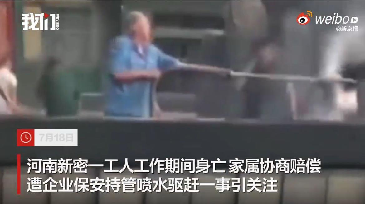 7月18日,河南新密一工人工作期间身亡,家属协商赔偿遭企业保安持管喷水驱赶一事引关注。新京报记者核实获悉,事发7月16日,涉事企业为郑州煤炭工业集团下属芦沟煤矿。家属称,死者因连续工作过劳死亡,事发后企业方未实际协商赔偿事宜。芦沟煤矿工作人员称,死者因病过世,否认保安喷水驱赶家属。企业人员称,因天气热,几个人说笑,用的是水管而不是水枪。