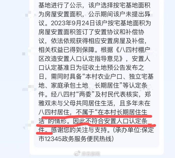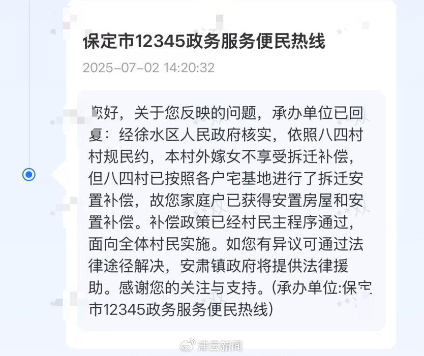 据报道,李女士就此事拨打了保定市12345热线咨询,村支书添加其微信后告知“外嫁女不享受本村拆迁安置补偿”,并称“村里这样的情况很多,别人都没说什么,为了这点钱不值当”。之后,李女士又通过河北省12345小程序反映此事,7月2日,保定市12345便民服务热线回复称,经徐水区人民政府核实,依照八四村村规民约,本村外嫁女不享受拆迁补偿。