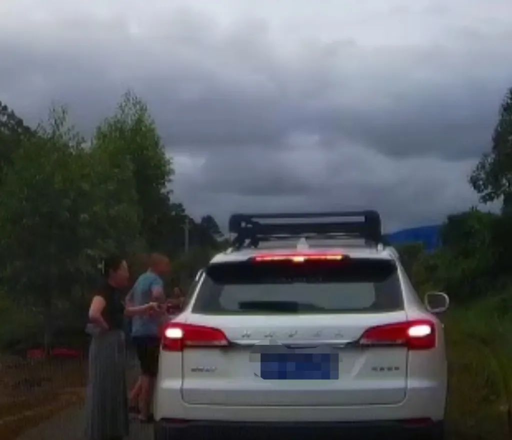 奔驰车上的男女下车和“平头哥”沟通让路,女司机左手中疑拿着一物品。