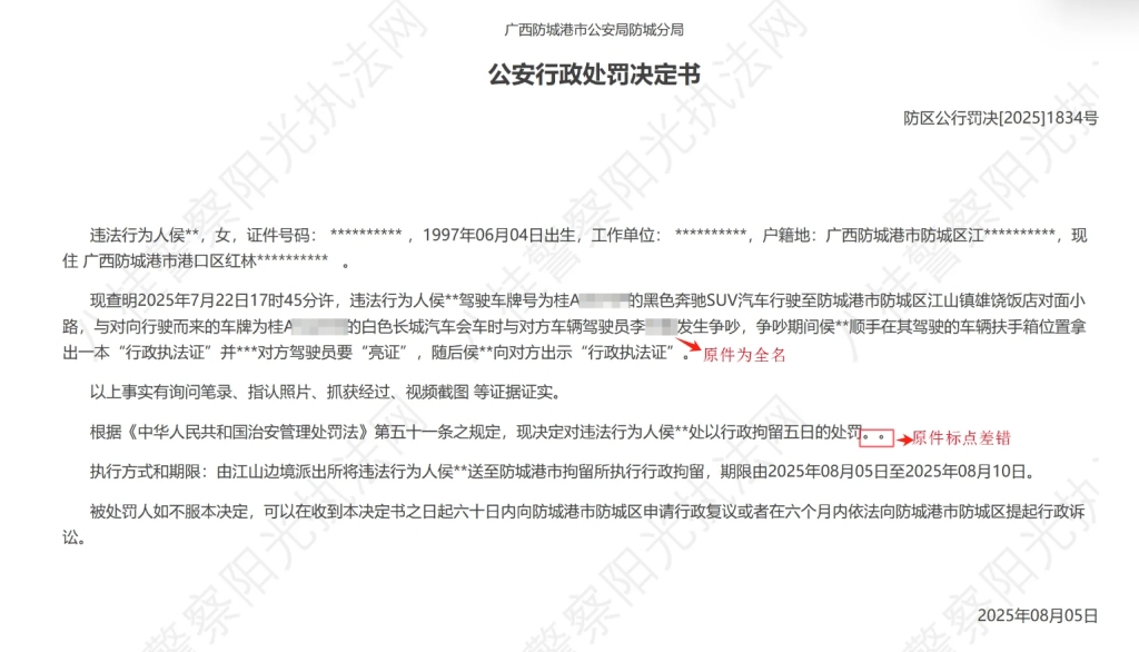 8月6日,据八桂警察阳光执法网消息,此前备受关注的防城港“亮证姐”侯某某因违反《治安管理处罚法》被处以行政拘留五日的处罚。
