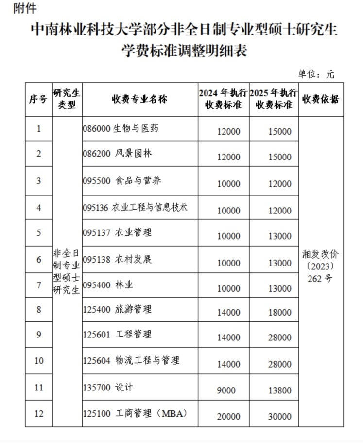 中南林业科技大学部分非全日制专业研究生学费标准调整明细表。