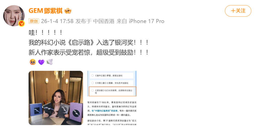 知名歌手邓紫棋跨界创作的长篇科幻小说《启示路》出现在第37届“中国科幻最高奖”银河奖海选投票名单,这条消息引发了不小的关注,邓紫棋本人也在个人社交账号发文表示“受宠若惊”。