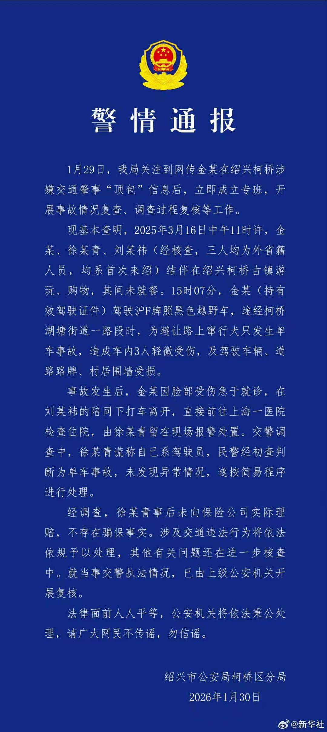 据通报,此次事故系金晨驾车时避让窜行犬只引发,事故造成车内三人轻微受伤及财产损失。事发后,金晨因脸部受伤需紧急就医,前往上海治疗,其助理徐某青留守现场报警,却谎称自己是驾驶人。经查,徐某青未向保险公司申请理赔,不存在骗保事实,相关交通违法行为正依法处置,当事交警执法情况也由上级公安机关复核。