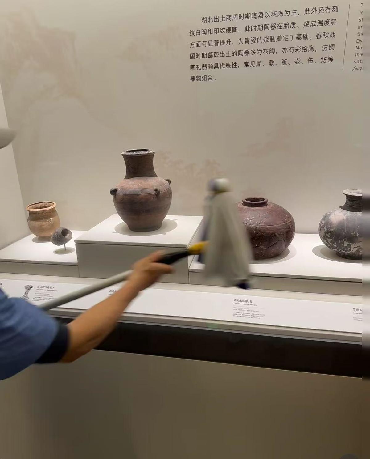 湖北省博物馆北馆三楼保洁周师傅现身评论区,留下了独门绝技:“需用净化水如矿泉水,勾兑几滴玻璃水,用干净整洁的毛巾湿透捞起拧干……上下来回一个方向擦拭……”网友纷纷表示,学到了!感谢师傅!周师傅也因此过了一把“网红”的瘾。