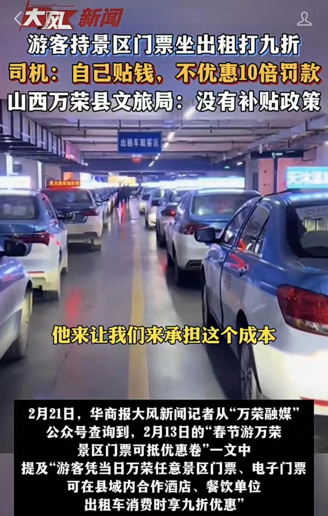 山西万荣县文旅局和工科局联合开展“春节游万荣,景区门票可抵优惠券”活动,引发出租车司机不满。图/万荣融媒