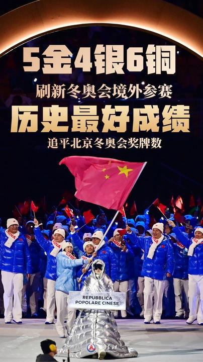 米兰冬奥会收官日,中国运动员谷爱凌、李方慧包揽自由式滑雪女子U型场地技巧冠、亚军,将中国代表团奖牌数定格于5金4银6铜,超越2010年温哥华冬奥会的5金2银4铜,刷新了冬奥会境外参赛历史最好成绩。