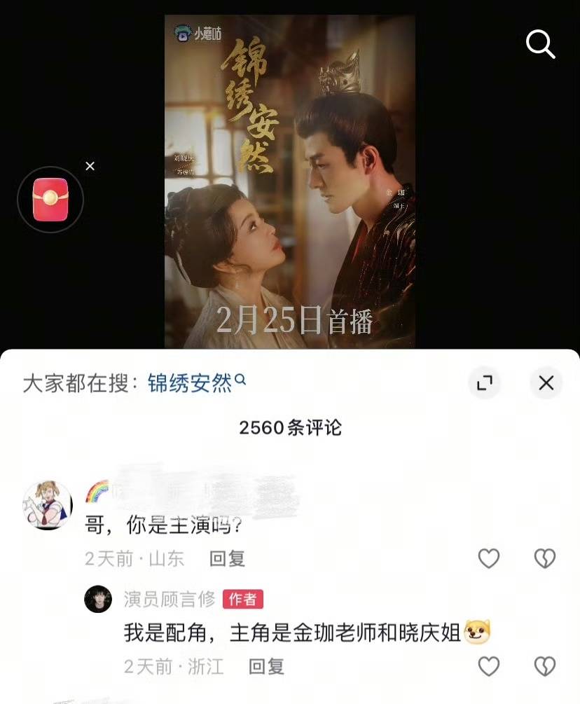 近日,刘晓庆主演的短剧《锦绣安然》因吻戏上了热搜,但真正引发广大关注的,不是75岁的她和小30多岁男演员金珈的年龄差,而是网友“演员顾言修”点赞了“你这是工伤”的评论,其演员身份让网友误以为是拍对手戏的搭档。随后,片方迅速发布声明,该演员并非《锦绣安然》演职人员。