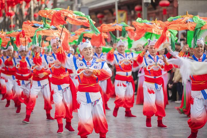 跑驴、舞龙、舞狮、高跷轮番上阵,火塔塔、陕北说书、三弦弹唱集中亮相,高空狮子、南方百叶龙、朝鲜族舞蹈同台竞技。如此多样的风格,堪称民俗大观园。