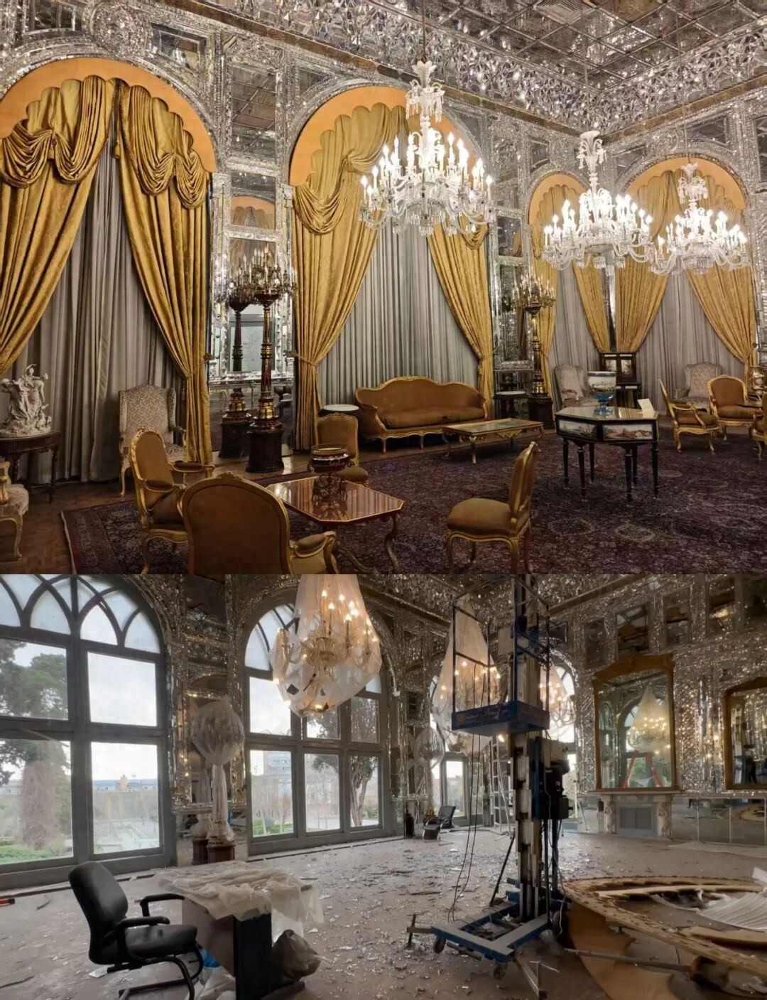 富丽堂皇的戈勒斯坦宫的宫殿厅里,天花板、水晶灯、玻璃门、窗户碎片砸得地上到处都是,受损区域一片狼藉。