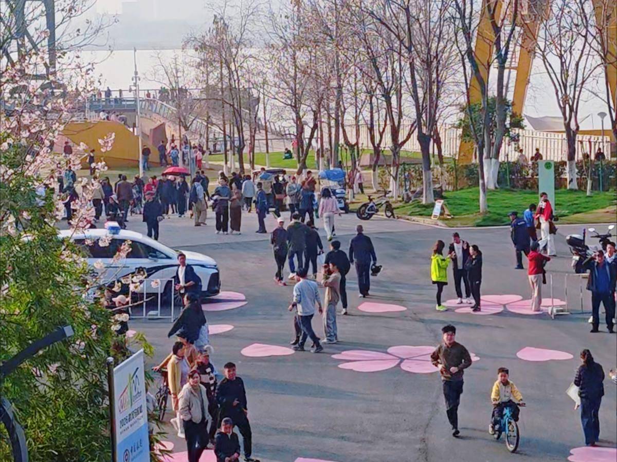 青山江滩的樱花跑道游人如织。(湖北日报全媒记者杜宇慧 摄)