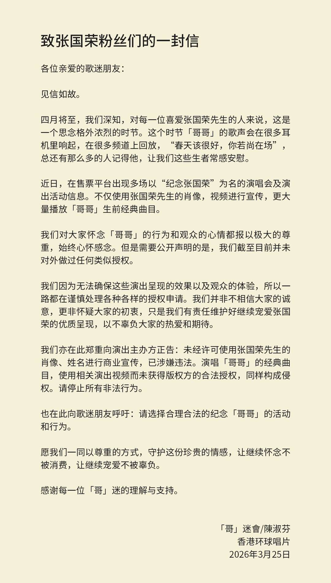 3月25日,版权方环球音乐携手张国荣挚友、前经纪人陈淑芬发布了一则联合声明:截至目前为止,并未对外做过任何类似“纪念演唱会”的授权。声明发布后,各大售票平台依然能正常购买,直到3月26日下午,部分演出开始陆续下架、退票。