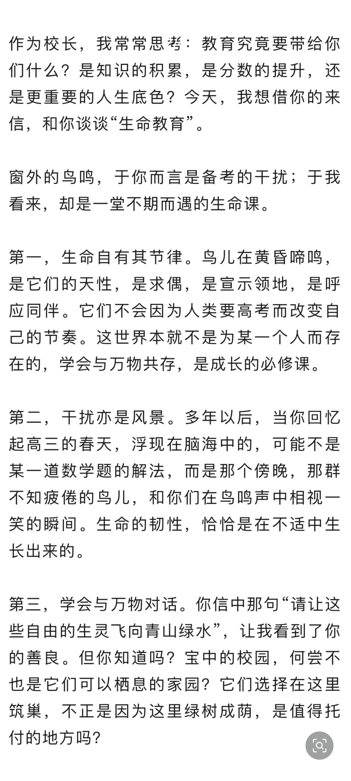 近日,深圳宝安中学(集团)高中部一名高三学生因备考期间受校园鸟鸣干扰,写信请求学校拆除鸟巢,“让这些自由的生灵飞向青山绿水”。该校党委书记、校长袁卫星并未简单采纳诉求,而是以一封公开回信答复这位匿名学生,将这一“自然干扰”视为一堂关于生命、自然与成长的教育课,引发舆论关注。