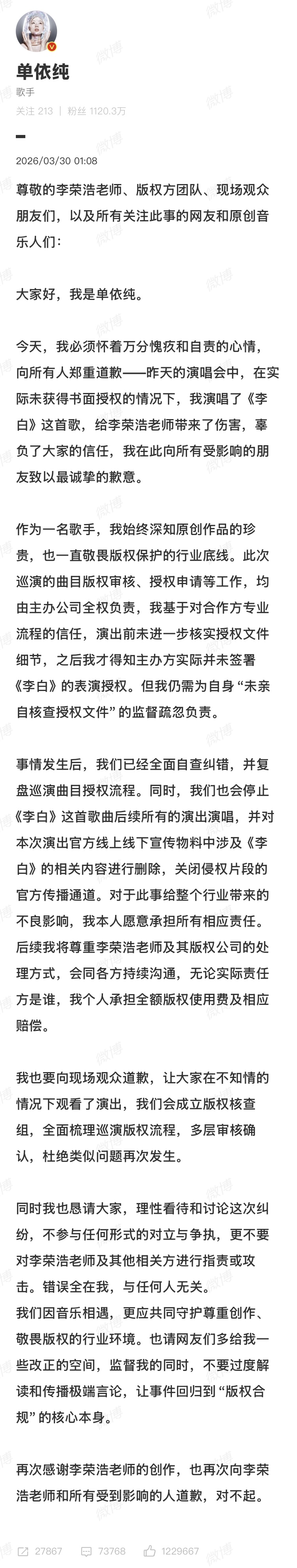 单依纯反应迅速、认错道歉毫不犹豫。但两件事放在一起看,仍不禁让人感慨,在音综里、演唱会上曾一次次听歌手们说“这首歌没拿到版权不能唱”,以为音乐界的版权意识早已深入人心,没想到还是会有不少音乐维权要靠“舆论战”解决——不发公开信,不闹上热搜,事情就很难得到解决。