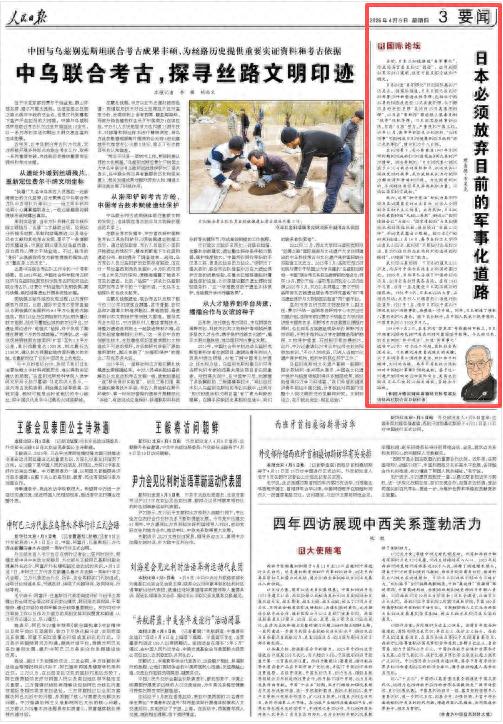 4月9日,《人民日报》第03版发表文章《日本必须放弃目前的军事化道路》。
