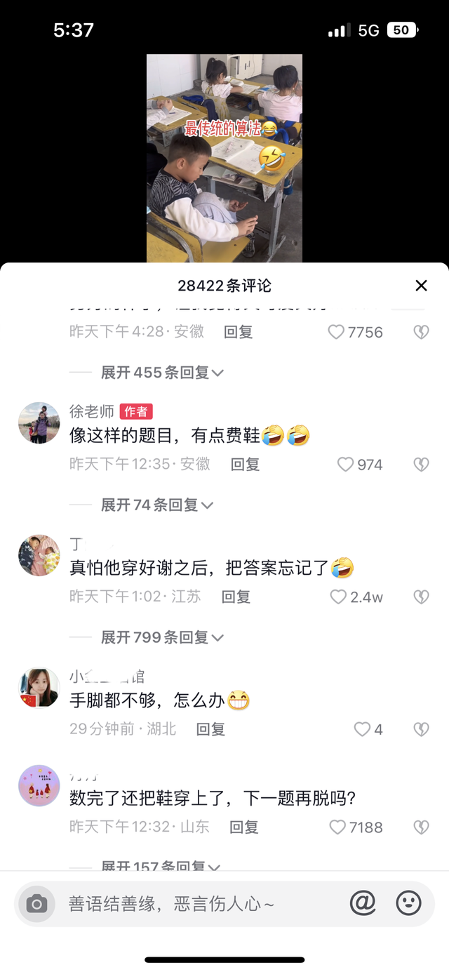 大皖新闻记者注意到,视频下方,网友们纷纷表示太好笑了。“真怕他穿好鞋之后把答案忘记了。”“数完了还把鞋穿上,下一题再脱吗?”“能算对就行。”“认真的态度值得表扬。”
