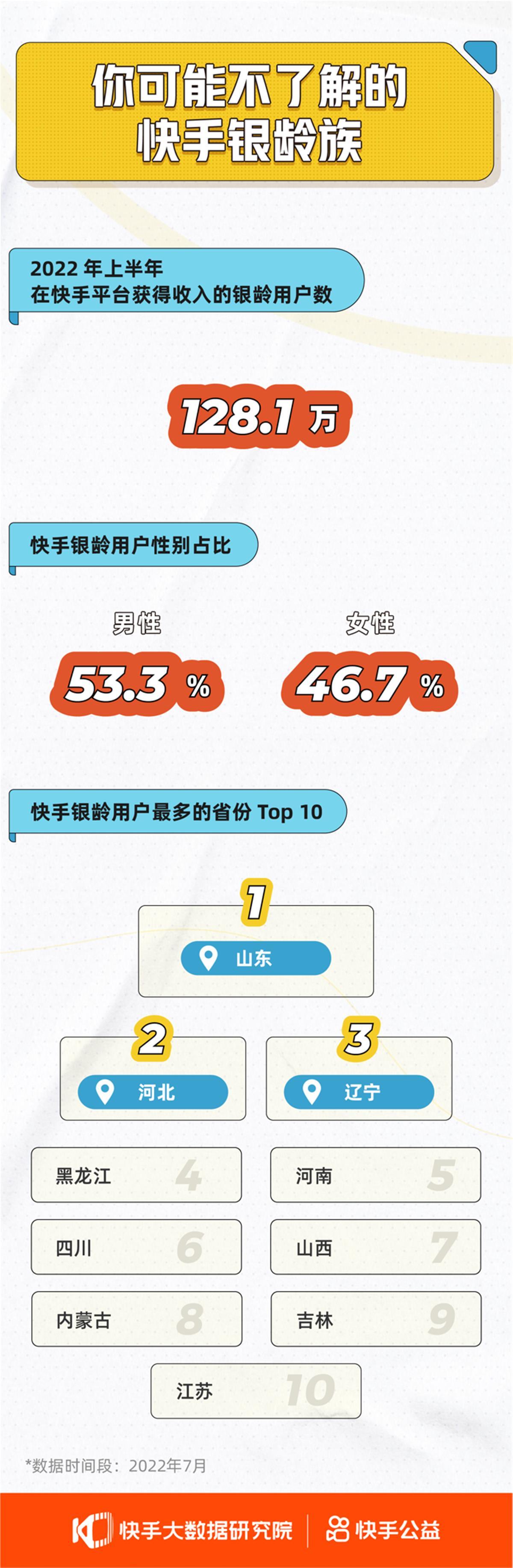 根据《报告》数据,快手银龄用户的性别分布相对均衡,男性略多,占比53.3%;银龄用户最多的省份是山东,其次是河北和辽宁。