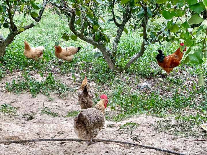民宿有个好听的名字叫做“老梨宿”,沉甸甸的石榴越过墙头,院子里的鲜花被妻子朱琴飞打理得很好,后院放养着鸡和鸭。