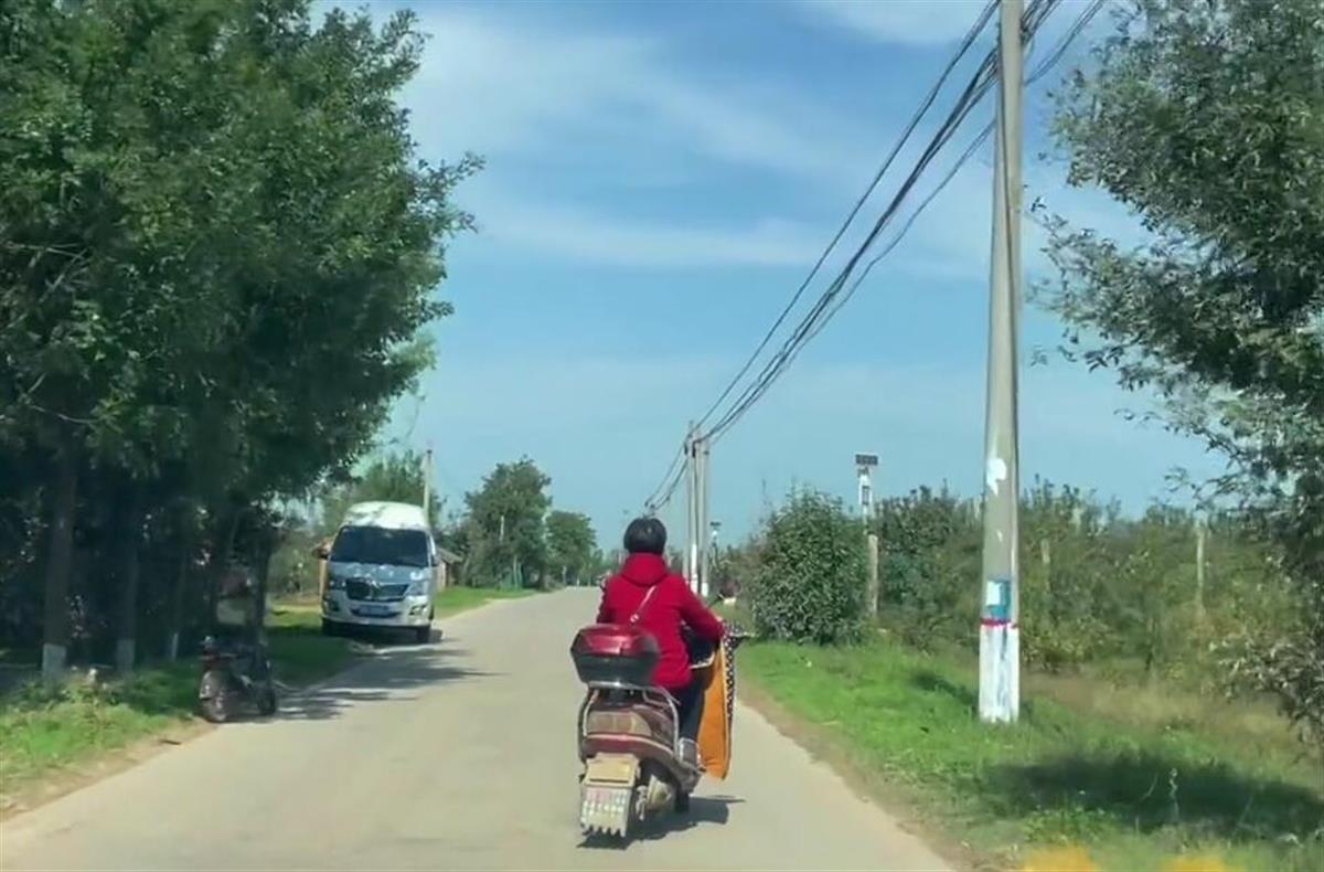 视频显示,在一条乡道上,一名女子骑着电动车正在前行,但从后面望过去,电动车车头是向右倾斜的,而车尾却是向左倾斜,整个人看起来是斜骑电动车,却走着直线。