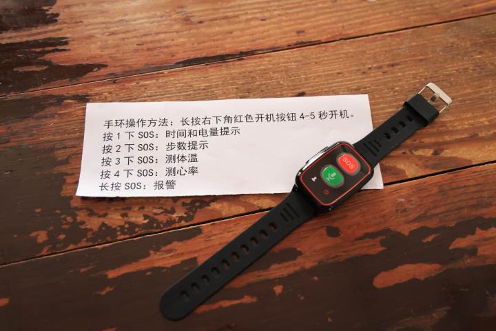 “按住右下角红色开机按扭4-5秒钟就开机了,按1下‘SOS’键,它会报时间和电量提示;按2下‘SOS’键,它会报走路步数;按3下‘SOS’键,它会报体温;按4下‘SOS’键,它会报心率;长按‘SOS’键,就是紧急呼救了。”因为手环需要绑定紧急联系人的信息,刘秋兰又核对了徐大伯儿子的电话。