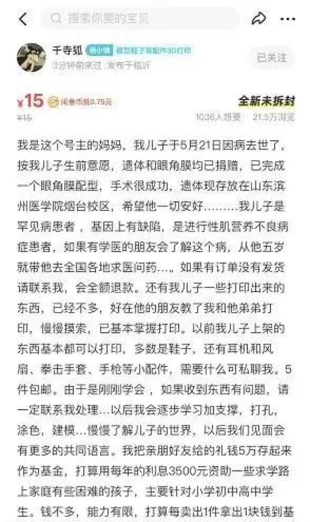 “我是这个号主的妈妈,我儿子于5月21日因病去世了,按我儿子生前遗愿,遗体和眼角膜均已捐献……如果有订单没有发货请联系我,会全额退款。还有我儿子以前打印出来的东西,已经不多,好在他的朋友教了我和他弟弟打印,慢慢摸索,已基本掌握打印,需要什么可私聊我,以后我会逐步学习加支撑、打孔、涂色、建模……慢慢了解儿子的世界。”