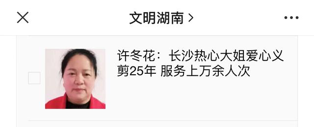 潇湘晨报记者查询文明湖南微信公众号发现,许冬花入选了2022年10月“助人为乐·湖南好人”候选之列。事迹简介为“许冬花:长沙热心大姐爱心义剪25年,服务上万余人次”。