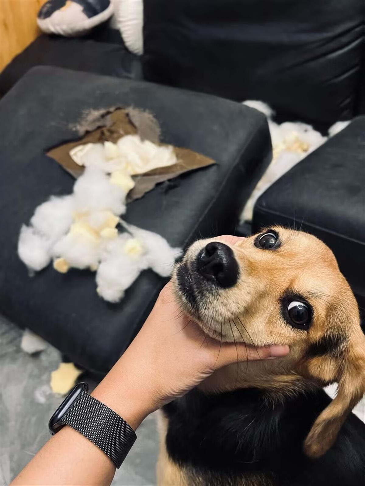 10月24日,家住重庆南岸区的何女士告诉极目新闻记者,她家里养了一条拉布拉多犬和一只捡来的小狗“年年”。几天前,她和丈夫出门吃午饭,将两条狗留在家里。饭后一回家就看到,小狗年年把客厅沙发上的垫子掏出了一个大洞,看到两人回来,还继续往外撕海绵。