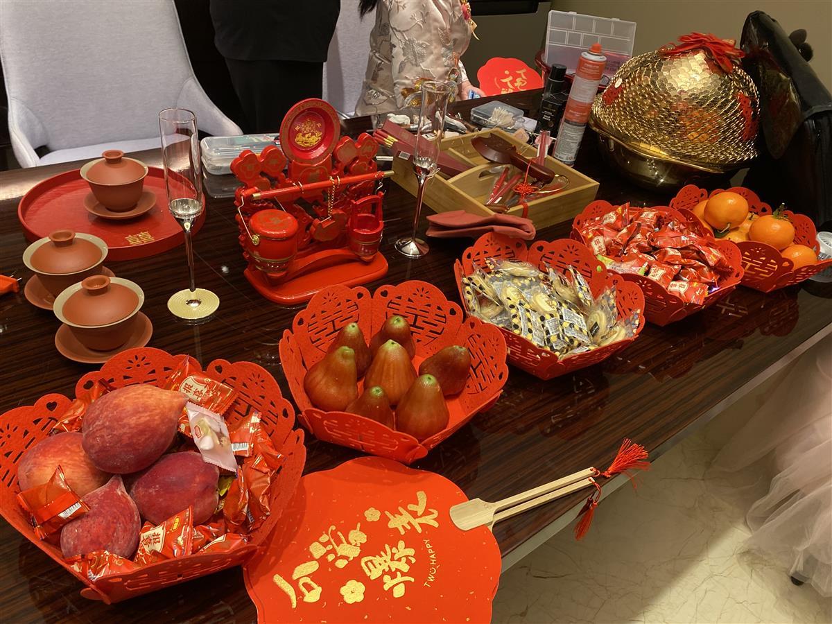 印象最为深刻的,是今年3月海口的一场婚礼,男方租了12个伴娘伴郎,请了11个摄影师,花费300多万元在酒店搭建婚宴现场。两位新人是国外留学相识,回国结婚办古典中式婚礼,走三书六礼流程,新娘穿着重达二三十斤、镶嵌红宝石的全金定制凤冠和金丝霞帔……