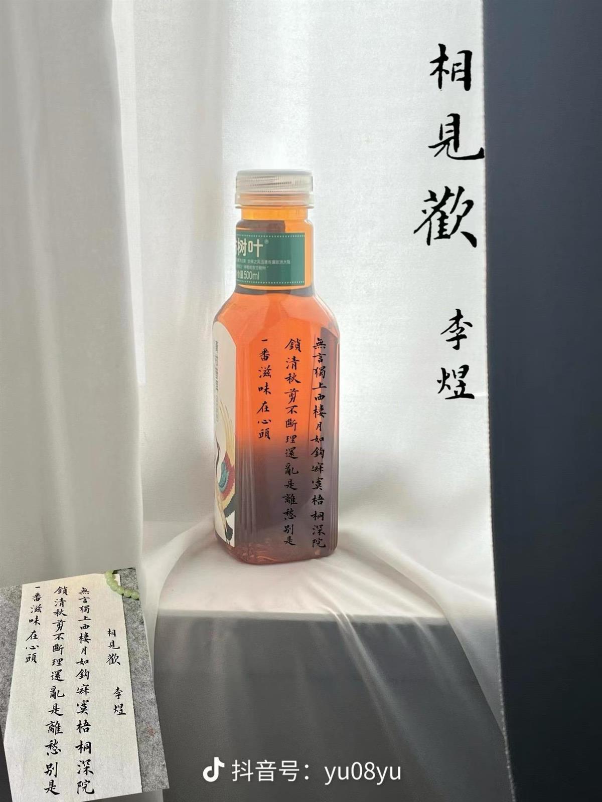 记者在网上看到,除了国画以外,还有一些网友在东方树叶饮料瓶上的书法作品关注度也非常高。其中“送君茉莉,愿君莫离”用东方树叶茉莉花茶的谐音表达情谊,深得网友喜爱,冲上热榜。另外,还有《虞美人》、《相见欢》等书法作品也点赞颇高,网友们边转发边点赞,还不忘调侃:没文化都不能喝东方树叶了。