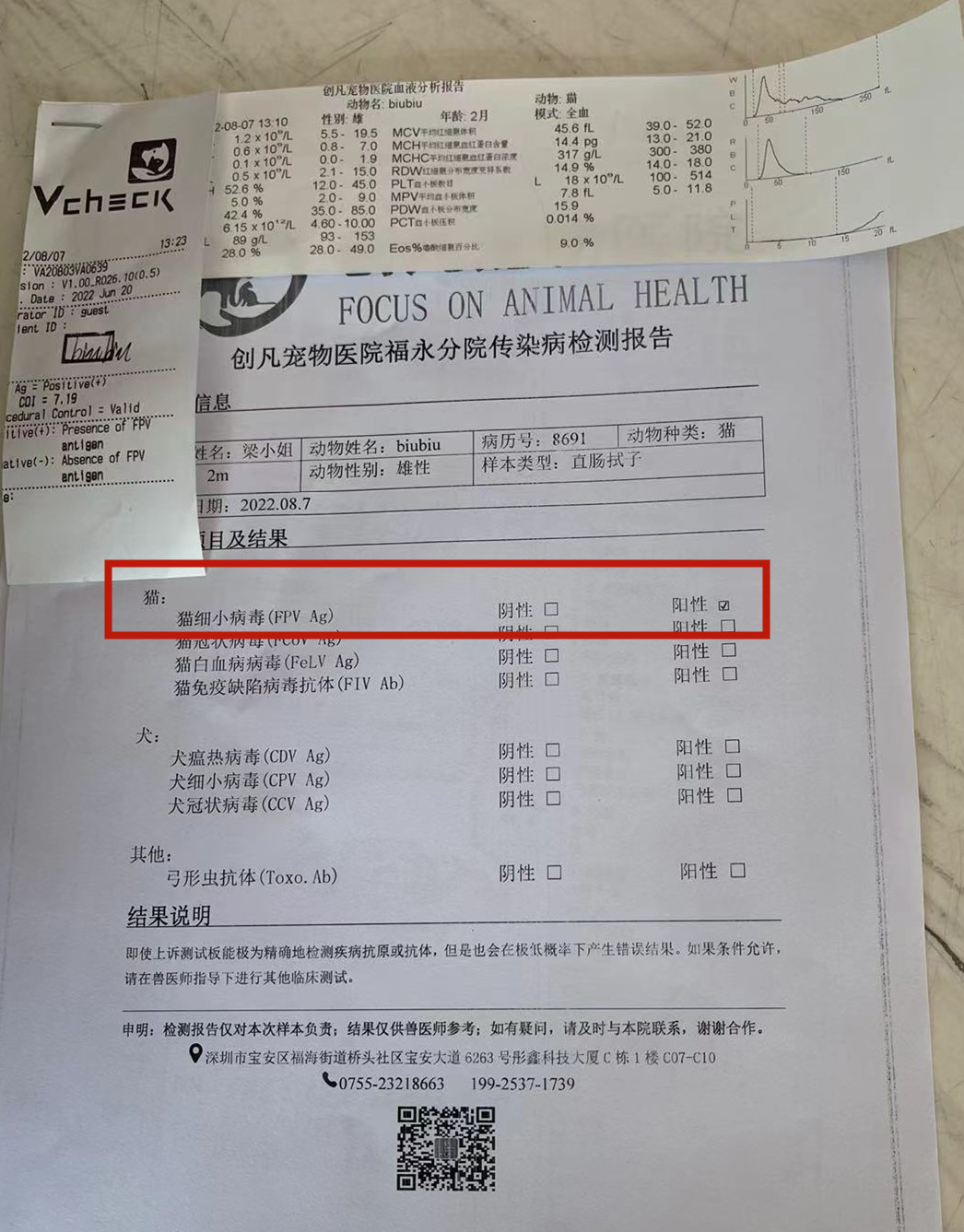 梁女士立即与店家联系,并按照店家提供的方法更换为鸡胸肉喂食。她说,之后小猫状况愈加糟糕,她最终在店家的建议下到医院检查,检验显示猫细小病毒呈阳性(俗称“猫瘟”)。当天下午,店家将猫接回店内观察。