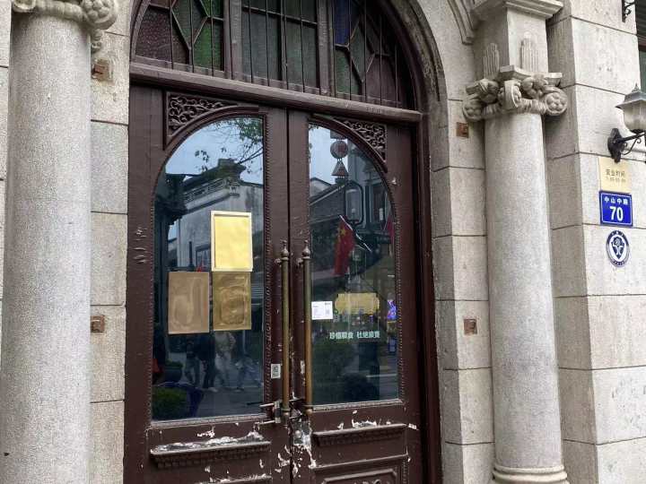 而河坊街这家造型复古的麦当劳店面,两侧大门都紧闭上锁,透过橱窗依稀可见里头的桌椅排放整齐。