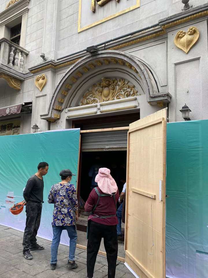 记者走近一看,确实有一处用绿色围挡拦住,几位看着像是负责装修的大叔在围挡后的门口处交谈。