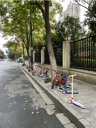 各种粉嫩颜色的滑板车和自行车,停放较为整齐,都是车头向外,还给人行步道留出了必要的空间。