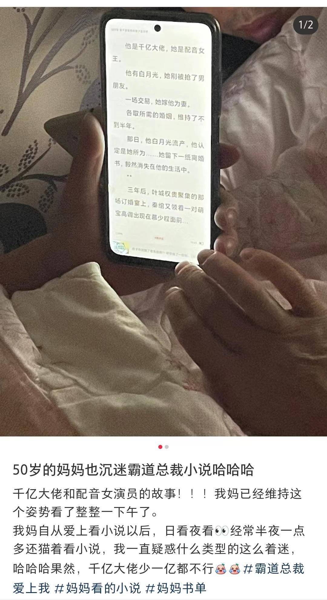 比较明显的特征是,“霸总式”都市言情小说从一系列“女性频道”题材中脱颖而出,成为中年女读者的“最爱”。网友@困困猪发文说,50岁妈妈沉迷霸道总裁小说,“千亿大佬和配音女演员的故事,她已经看了整整一个下午了。我妈自从爱上看小说以后,日看夜看,经常半夜一点多还猫着看小说。”