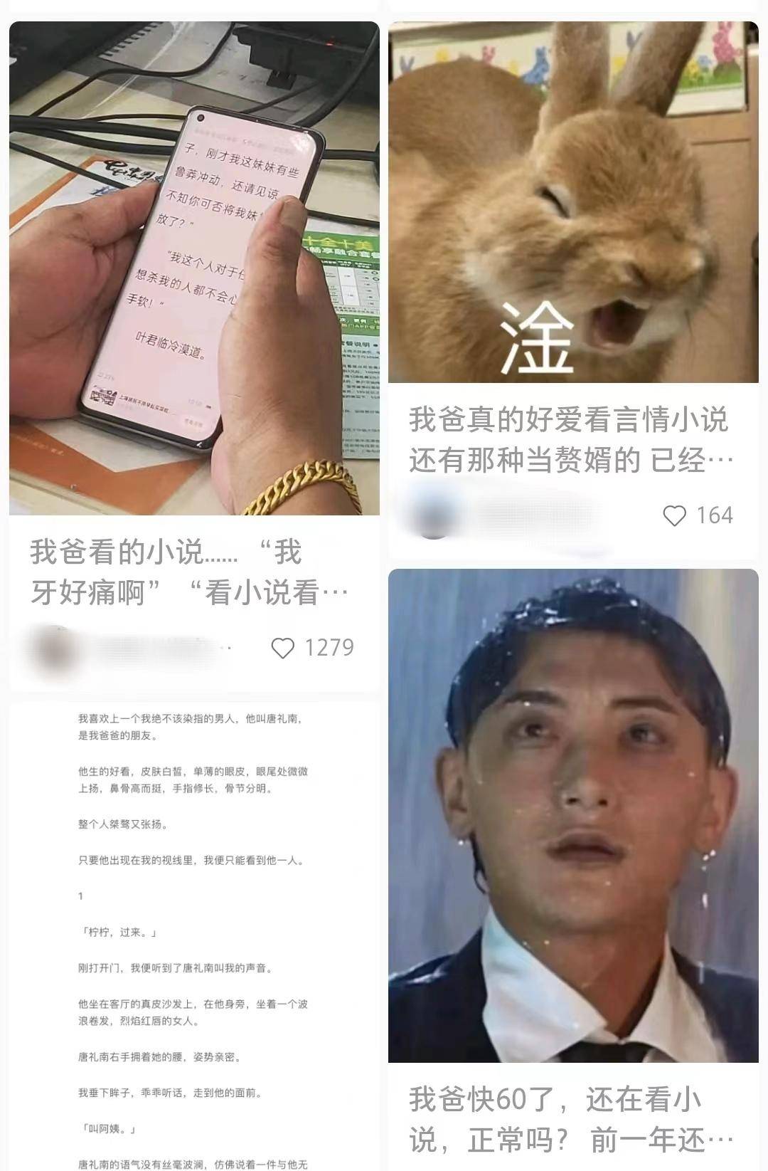而“赘婿式”式爽文从一系列“男性频道”题材中脱颖而出,成为中年男读者的“最爱”。网友@我爱吃羊肉发文说,爸爸真的好爱看言情小说,尤其是那种当赘婿的,“已经不止一次看到我爸坐沙发上,戴着老花镜聚精会神地看小说了。他还得意洋洋地对我妈说,特意花钱充值了这本书,能一直追着看。”