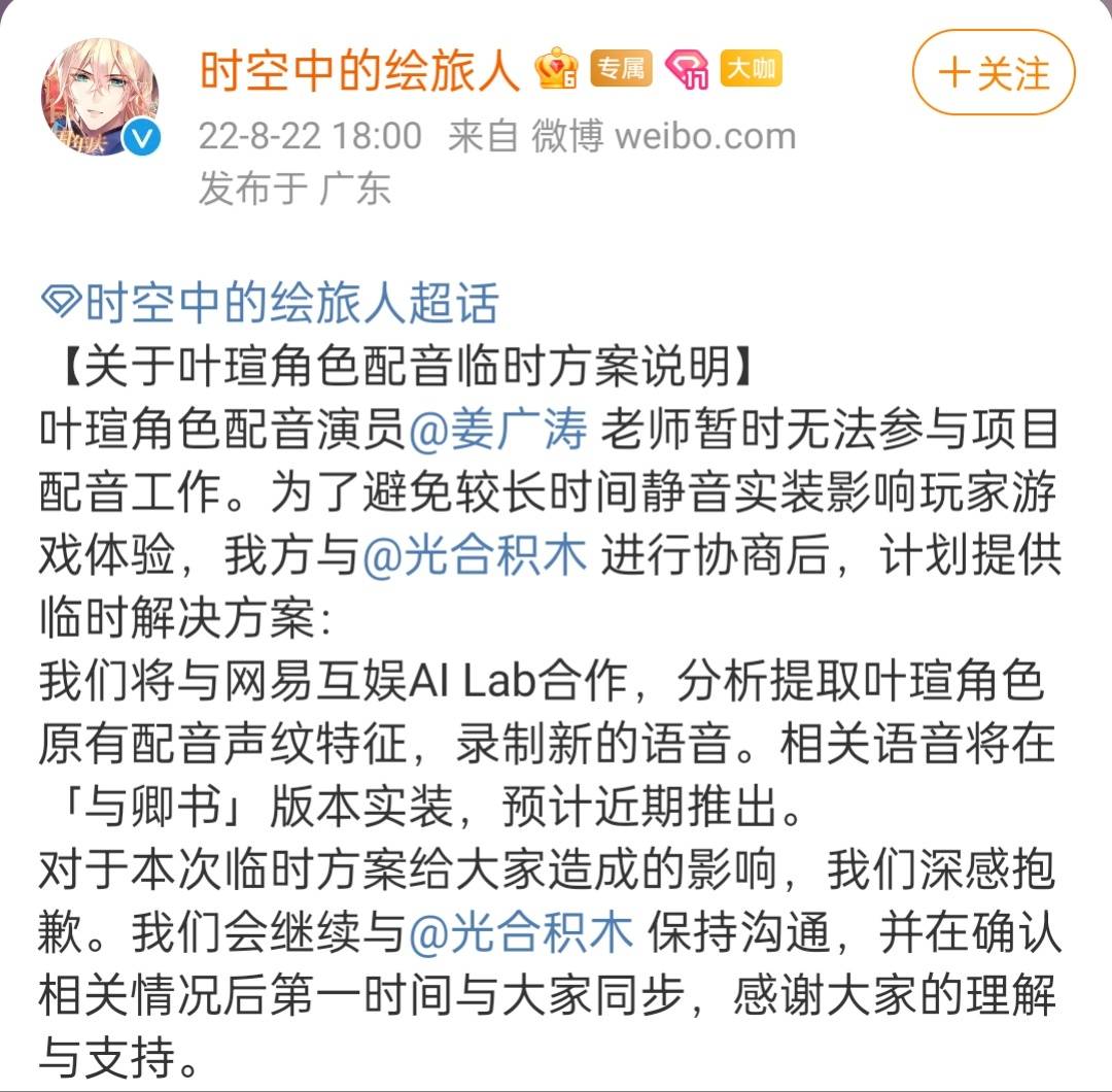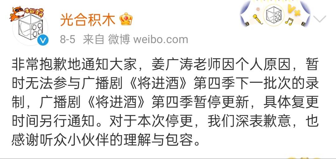 8月5日,光合积木就曾发文:“非常抱歉地通知大家,姜广涛老师因个人原因,暂时无法参与广播剧《将进酒》第四季下一批次的录制,广播剧《将进酒》第四季暂停更新,具体复更时间另行通知。对于本次停更,我们深表歉意,也感谢听众小伙伴的理解与包容。”之后,游戏《时空中的绘旅人》《未定事件簿》先后宣布,姜广涛配音的角色将采用AI配音的方式录制新的语音,《黑猫奇闻社》也官宣“风泽”一角的后续配音,由其他配音演员完成。