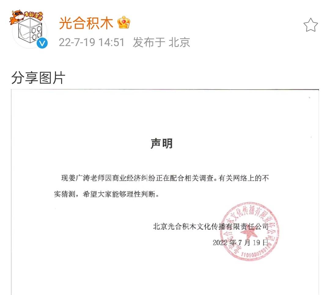 7月19日,有网友爆料称,一位配音演员被警察带走,并晒出相关照片。该爆料中虽未提及姓名,但通过姓名缩写以及照片中显示的“光合积木”字样,网友猜测是配音演员姜广涛。7月19日下午,姜广涛创建的光合积木工作室发布声明称:“现姜广涛老师因商业经济纠纷正在配合相关调查。有关网络上的不实猜测,希望大家能够理性判断。”