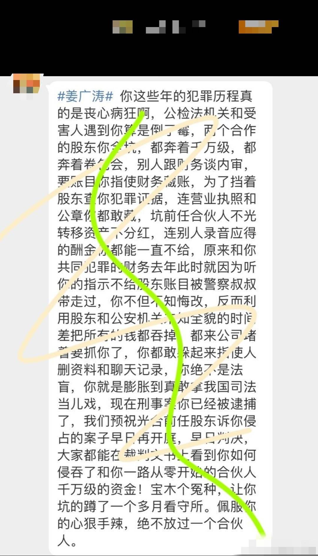 10月29日再上热搜,有网友爆料姜广涛疑似违法的细节,包括“两个千万级的合作股东都被他坑了”“指使财务藏账”等。对此,有网友评论:“cv塌房,纸片人遭殃”。也有网友表示:“作为粉丝,在没有任何通报之前,我选择相信,如果他真的进去了,也就saygoodbye了。我们选择相信,也不希望被辜负,那如果是真的,那我们也没有什么办法了。”
