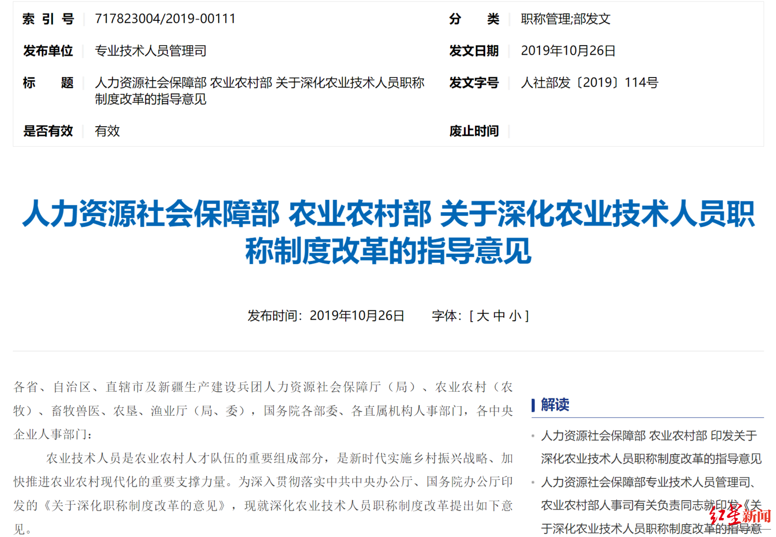 红星新闻记者查阅发现,1994年10月,国家原人事部、农业部曾发布《农业九专业中、高级技术资格评审条件(试行)》。文件显示,该评审主要针对于从事农业工程专业技术推广、科技研究、生产指导、技术监督等工作的技术人员,专业分为农业机械化、农业电气化与自动化、农业环境工程、农业水土资源利用与整治、农村能源工程、农产品储运与加工,职称分为工程师(中级)和高级工程师。
